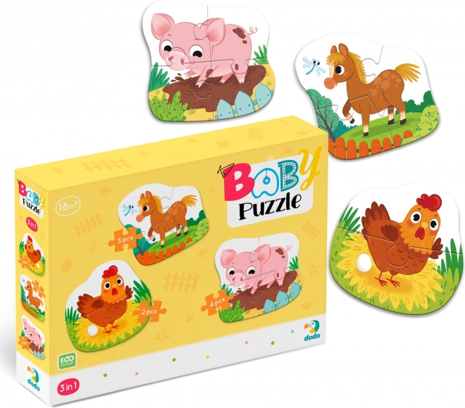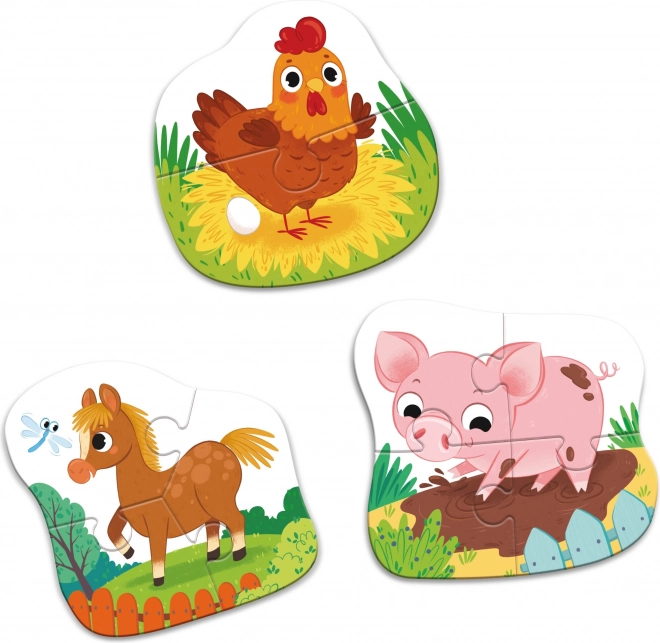 Questo set di baby puzzle è la scelta ideale per il primo approccio dei bambini ai puzzle. Tre immagini sagomate separate con animaletti della fattoria hanno un numero diverso di pezzi (2, 3 e 4), così il bambino può migliorare gradualmente e provare la gioia del successo con ogni immagine completata.