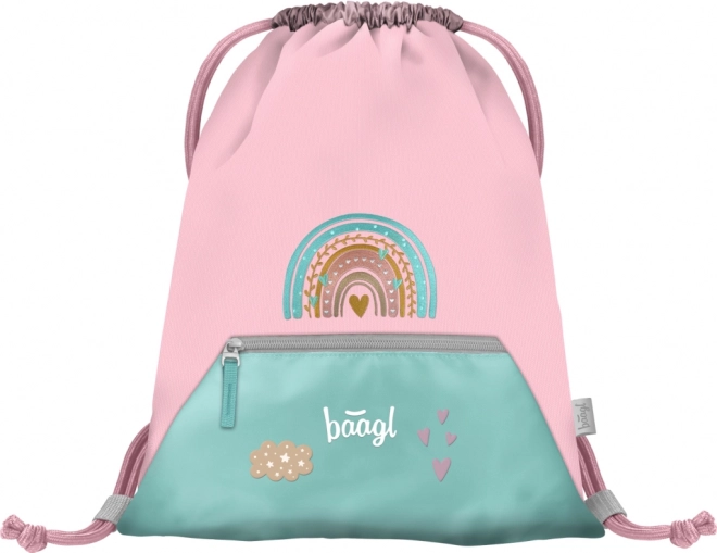 Pratica sacca scolastica BAAGL per scarpe e attività del tempo libero nel raffinato design rosa Arcobaleno. Offre un materiale robusto e lavabile, una tasca pratica con cerniera nella parte inferiore e una chiusura a coulisse con cordini robusti, che consente un comodo trasporto sulla schiena. Grazie al moschettone si aggancia facilmente alla cartella.