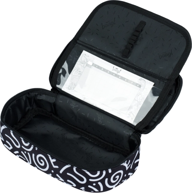 L’astuccio tipo etui con aletta ribaltabile, taschino con cerniera e spazio per l’orario mantiene tutto in ordine. La sacca con cordini robusti è resistente e lavabile, pronta per attività e ginnastica.