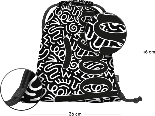 Astuccio rigido tipo etui con aletta ribaltabile, tasca con cerniera e spazio per l’orario. Sacca lavabile con cordini robusti, adatta per scarpe e attività del tempo libero.