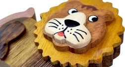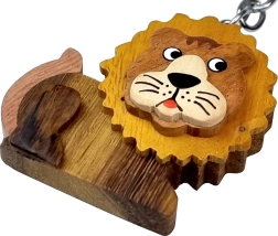 Questo portachiavi in legno fatto a mano a forma di leone diventerà un ornamento per le tue chiavi, borse o zaini. Il prodotto è realizzato con cinque tipi di legno naturale: giallo altrove, marrone chiaro tamarindo manila, marrone scuro cassia comune, rosa aniba e bianca gmelina arborea. Il legno non è colorato, è lasciato in forma naturale, e il design complessivo è completato dalla pittura a mano.