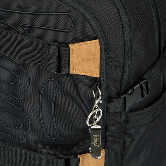 Due cinghie frontali per fissare lo skateboard, materiale resistente e idrorepellente e affidabili cerniere YKK. Incluso anche un portachiavi in metallo a forma di skate.