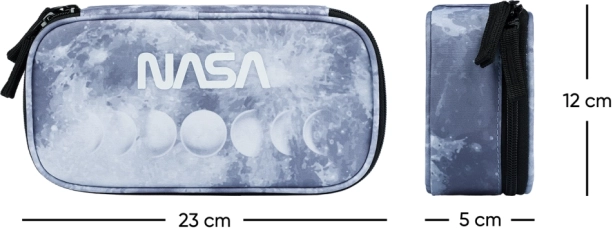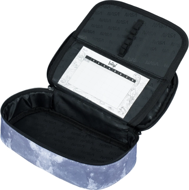 L’astuccio di tipo etui in materiale riciclato dispone di divisorio ribaltabile, tasca con cerniera e scomparto per l’orario. La sacca con motivo NASA è in materiale robusto e lavabile e, grazie alle coulisse, può essere portata anche sulla schiena. L’intero set è progettato per l’uso quotidiano ed è stato testato in un laboratorio accreditato.