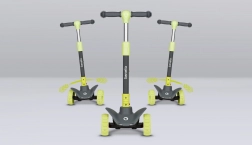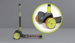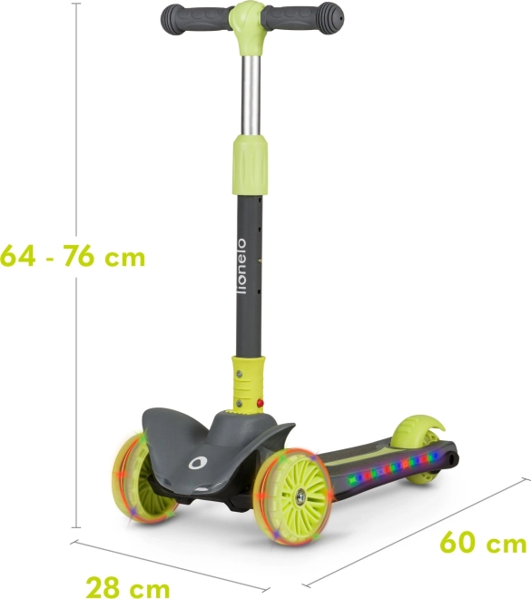 Design unico disponibile in tre colori unici: verde, rosa e arancione. Le luci LED poste sulle ruote e sulla pedana aggiungono attrattiva durante la guida e sono alimentate dal movimento, mentre le luci sulla pedana sono alimentate da tre batterie AA.