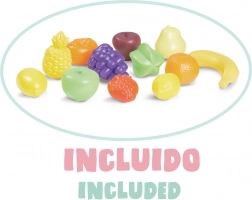 Il set include 12 pezzi colorati di frutta in plastica che favoriscono la conoscenza degli alimenti e lo sviluppo della fantasia durante il gioco del negozio.