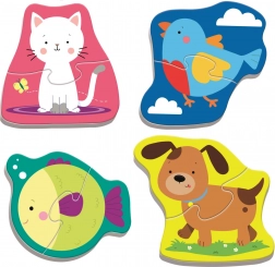 Scoprite i primi puzzle per i più piccoli: 4 adorabili puzzle a tema animali domestici. Ogni immagine è composta da 2 grandi pezzi, così i bambini raggiungono il successo rapidamente e vorranno ricominciare a comporre più e più volte. I colori vivaci e le illustrazioni amichevoli invitano naturalmente al gioco.