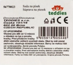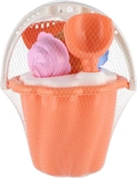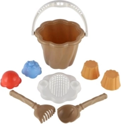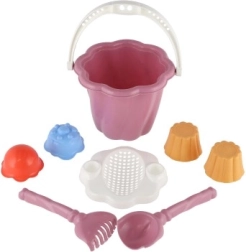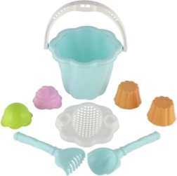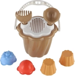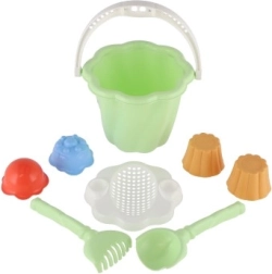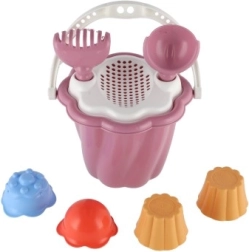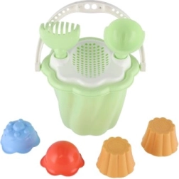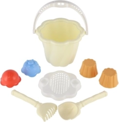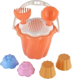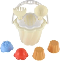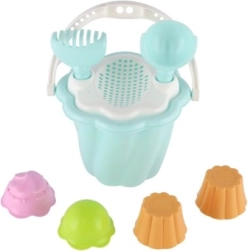 Questo set comprende secchiello, paletta, rastrello e quattro formine, ideale per ore infinite di gioco nella sabbiera o in spiaggia.