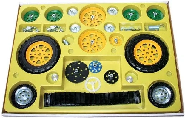 Questo set di costruzioni contiene tutto ciò di cui hai bisogno per costruire diversi modelli, inclusi grandi ruote da trattore e ingranaggi.