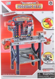 banco da lavoro in plastica con attrezzi per piccoli artigiani, che include un trapano a batteria, una morsa, pinze, sega, martello e varie chiavi.