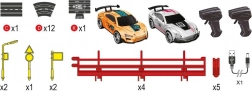 Nella confezione trovi tutto il necessario per correre subito: 2 vetture speciali da corsa, 2 controller manuali e pratici accessori. Grazie alle dimensioni compatte di 90 × 65 cm, la pista si adatta a un tavolo o alla cameretta.