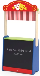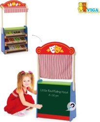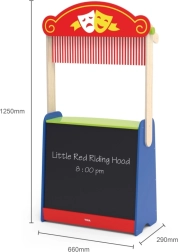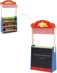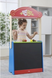 Questo giocattolo in legno di alta qualite0 combina un teatro di marionette domestico e un negozietto per bambini in un unico prodotto. I bambini possono cambiare scene e ruoli in un attimo: quando si rappresenta una fiaba, si tirano le tende e sulla lavagna nera si scrive il titolo dello spettacolo; durante il gioco del negozio, invece, il nome dell’esercizio, i prezzi o le promozioni.