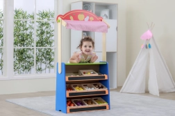 Il chiosco offre ripiani ordinati per riporre alimenti e accessori (venduti separatamente). La struttura robusta, i dettagli cromatici accattivanti e la tenda parasole invitano al gioco creativo e ad attivite0 condivise. Il giocattolo sviluppa immaginazione, creativite0, pensiero logico e comunicazione.
