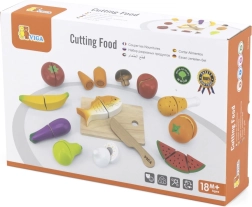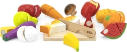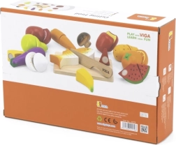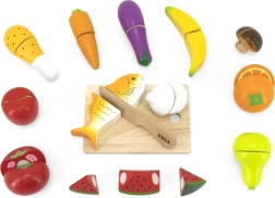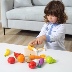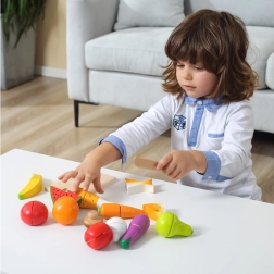 Scopri un gioco divertente ed educativo con il set di alimenti in legno VIGA per bambini da 18 mesi. Grazie ai magneti/velcri, i singoli pezzi possono essere “tagliati” in sicurezza con il coltello di legno sul tagliere, sviluppando la motricità fine, la coordinazione occhio–mano e stimolando fantasia e giochi di ruolo nella cucina dei bambini.