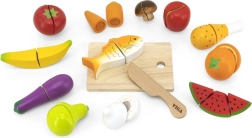 Questo set in legno di qualità include una selezione varia di frutta, verdura e altri alimenti – dalla banana e l’anguria alla carota, al pomodoro e al pesce. I bambini possono provare in sicurezza a tagliare con il coltello di legno sul tagliere e imparare a riconoscere i vari alimenti, i colori e le forme. Ideale per il gioco autonomo o per cucinare insieme ai genitori.