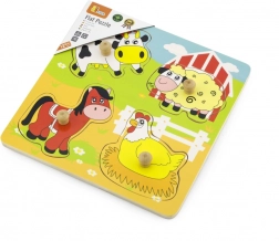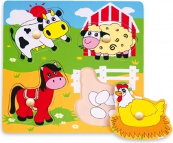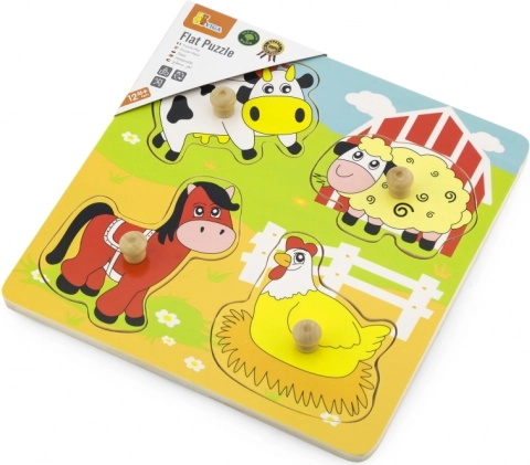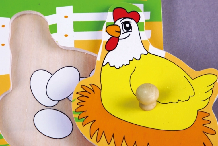 La tavola in legno resistente, di circa 22 × 22 cm, è riccamente illustrata con un tema della fattoria che stimola il gioco e l’arricchimento del lessico (ad es. mucca, pecora, cavallo, gallina). Il gioco è adatto dai 12 mesi e, grazie alle dimensioni compatte, si ripone e si trasporta facilmente.