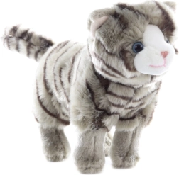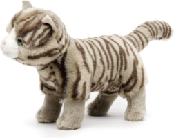 Il peluche soffice con delicata zebratura e occhietti azzurri appare credibile e invita alle coccole.