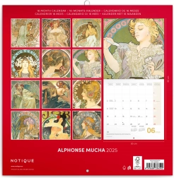 Elegante calendario per appunti con riproduzioni delle opere del maestro dell'Art Nouveau ALFONS MUCHA per il 2025, offre un calendario chiaro da settembre 2024 a dicembre 2025, sei versioni linguistiche, le fasi lunari, le festività importanti e ampio spazio per le note quotidiane. Ideale come decorazione di stile e pratico planner.