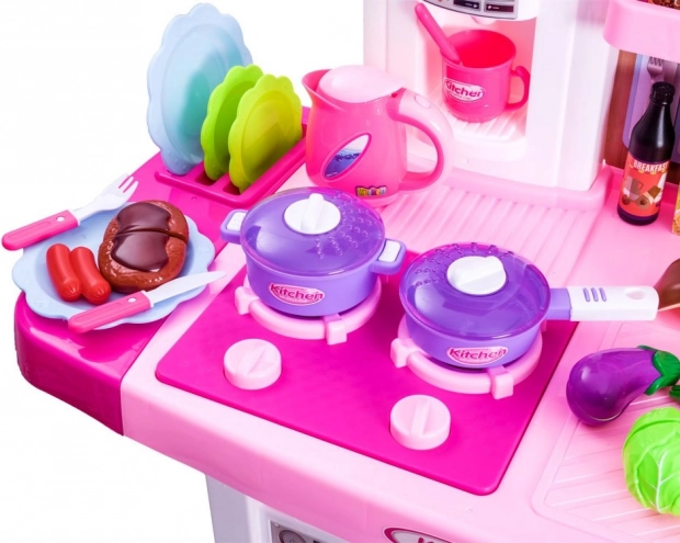 Questa cucina sapientemente attrezzata offre ai bambini un'esperienza di cucina autentica: due fornelli con luci e suoni, forno, frigorifero, lavello con rubinetto e acqua corrente, cappa aspirante, orologio e persino un'asse da taglio integrata. Sono inclusi anche ganci appendibili, scolapiatti, mensole per le spezie e una macchina del caffè.