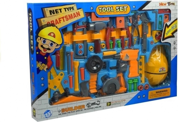 Il set include elementi motorizzati (trapano, smerigliatrice e sega circolare) alimentati da 2× batterie AA 1,5 V, oltre a utensili manuali e materiale di fissaggio per costruire e avvitare. La pratica cintura da lavoro mantiene gli strumenti sempre a portata di mano e favorisce autonomia e organizzazione del lavoro.