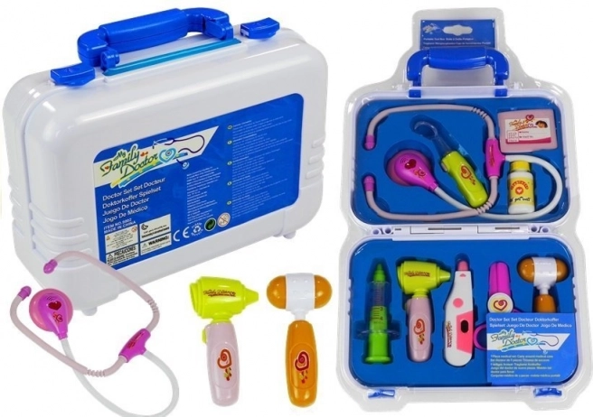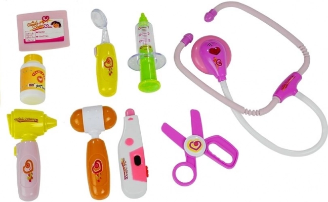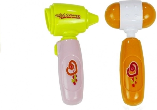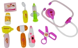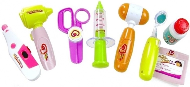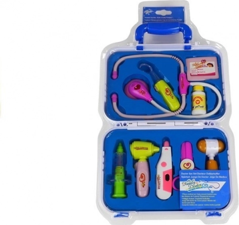 - Siringa, otoscopio/strumento esplorativo con lucina, termometro regolabile, forbici, martelletto per riflessi, specchietto con illuminazione, stetoscopio con suono del cuore, barattolo per medicine, targhetta del medico di famiglia, valigetta in plastica