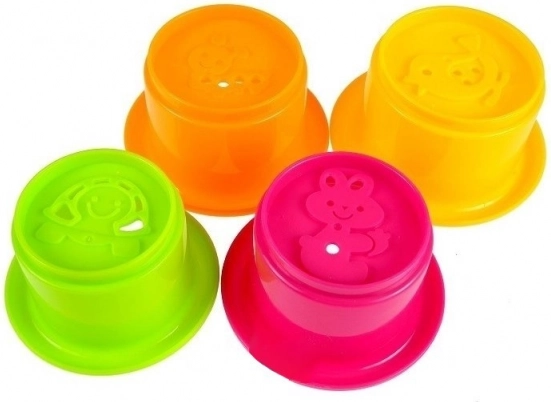 Il set include tazze colorate impilabili con motivi di uccellino, lombrico e coniglietto per ulteriore divertimento.