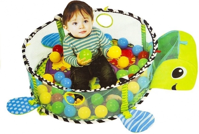 Questo tappetino è progettato per essere utilizzato in diversi modi: il bambino può giocare sdraiato sulla pancia, sulla schiena o seduto. La confezione include 30 palline colorate che, dopo il gioco, possono essere riposte facilmente nella testa della tartaruga, trasformando lo spazio di gioco da piscinetta a tappetino. Il tappetino comprende anche quattro diversi giocattoli marini sospesi che alimentano la curiosità del bambino.