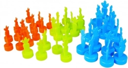 Il gioco include carote di plastica colorate in arancione, verde e blu, che rappresentano valori di punti diversi. Questi elementi sono ideali per un gioco divertente e visivamente attraente.