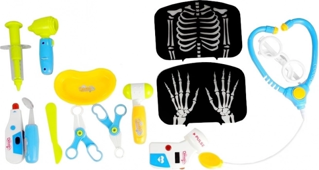 Include una ricca gamma di accessori: stetoscopio, forbici, bisturi, martelletto per riflessi, pulsossimetro, occhiali, lavagna medica, radiografie di testa, torace e mani, scatoline di “medicine” e altri piccoli accessori. Il set è ideale per lo sviluppo della motricità fine, i giochi sociali e la creatività.