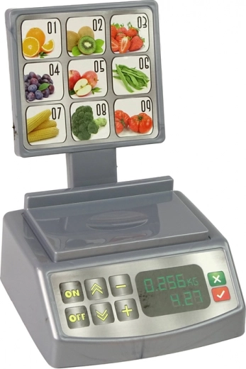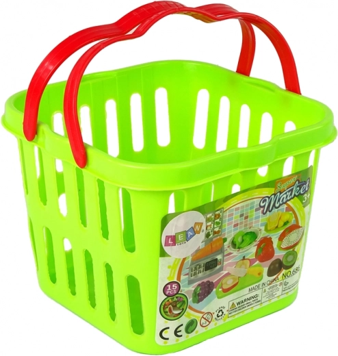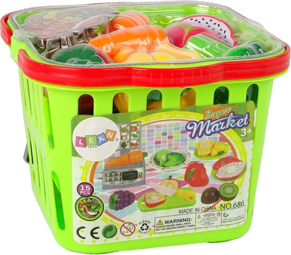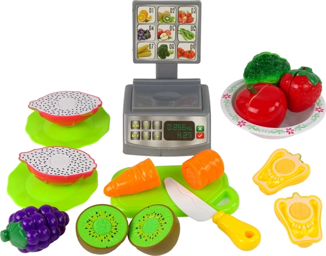Il set è composto da un cestino verde pieno di frutta e verdura assortite, una ciotola, piatti, coltello, tagliere e una bilancia da negozio. Gli alimenti si possono disporre sul tagliere in dotazione e tagliare con lo speciale coltello. Le metà di frutta e verdura si possono pesare sulla bilancia, che è una copia esatta di quelle dei supermercati, e poi mettere nei piatti o mescolare nella ciotola. Dopo la degustazione, le metà di frutta e verdura si possono unire facilmente e immediatamente. Come? Tutti gli alimenti sono dotati di speciali strisce in velcro che ne consentono la ripetuta separazione e combinazione.