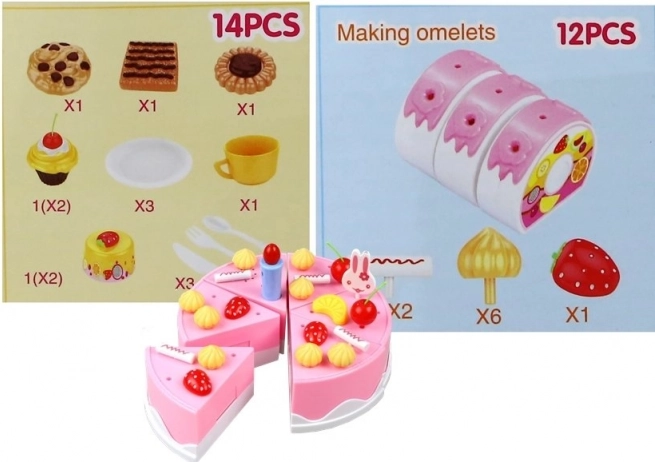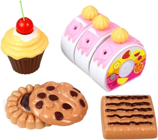 Cupcake, biscotti e una fetta di rotolo completano ogni merenda dei bambini. I pezzi sono colorati e invitanti per il gioco di fantasia della pasticceria.