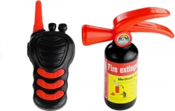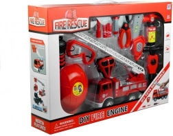 - camion dei pompieri con scala estensibile, casco, occhiali, maschera, estintore, ricetrasmittente, sega, pinze, cacciavite e altri attrezzi con punte