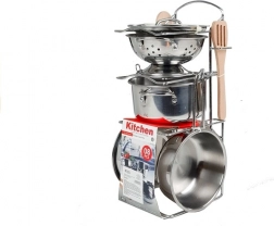Il set include scolapasta, pentola, padelle, utensili da cucina in legno e supporto per organizzare tutti i componenti.