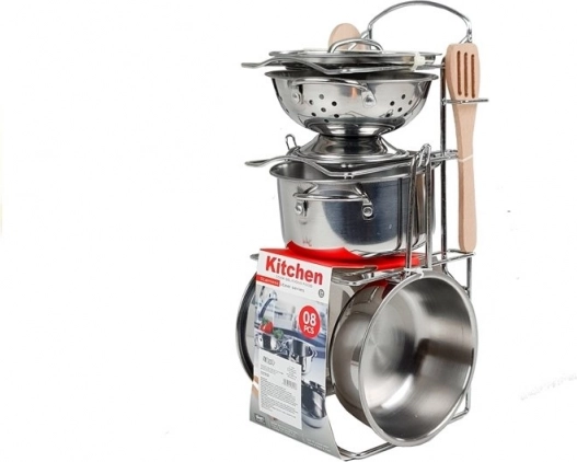 Questo set di utensili da cucina in acciaio inox è il complemento perfetto per i piccoli chef. Include una vasta gamma di componenti che offrono innumerevoli possibilità di gioco nella preparazione e nel servizio di deliziosi piatti. Grazie all'aspetto realistico e alle dimensioni confortevoli, il set è ideale per le mani più piccole.