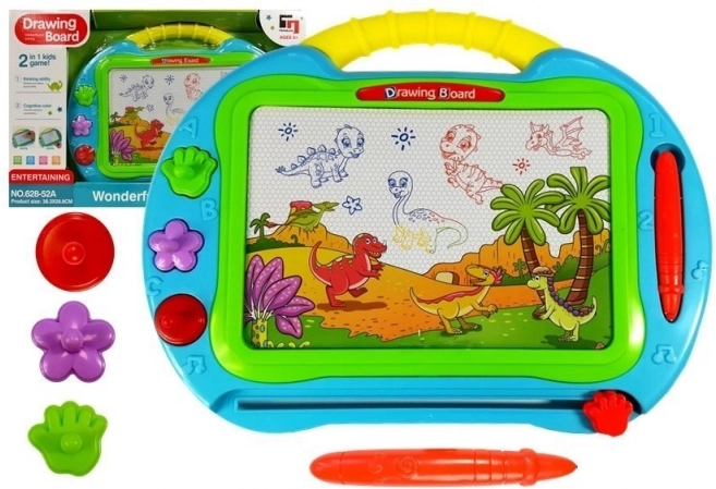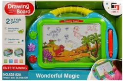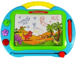 Questa grande lavagnetta magnetica da disegno permette ai bambini di disegnare e scrivere all'infinito – senza disordine e senza carta. Sotto la superficie dello schermo ci sono limature di ferro che, al tocco dello stilo magnetico, si dispongono formando tracce visibili. I timbri a forma di cerchio, zampa e fiore aggiungono dettagli originali ai disegni e aiutano a sviluppare l'immaginazione.