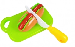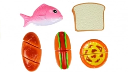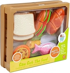 Scoprite il divertente mondo della cucina con il set di alimenti per bambini, in cui ogni pezzo è unito dal velcro. I bambini possono preparare un hot dog, servire il pesce, tagliare il pane o “cuocere” un cupcake. Il coltello di plastica sicuro e il tagliere permettono un taglio realistico, ma assolutamente sicuro.