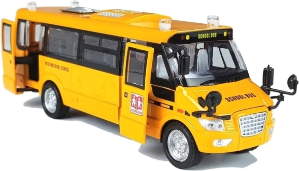 Le porte laterali e posteriori e il cofano si aprono; finestre trasparenti e particolari curati (specchietti, copricerchi, scritte) creano l’aspetto autentico di un autobus scolastico.