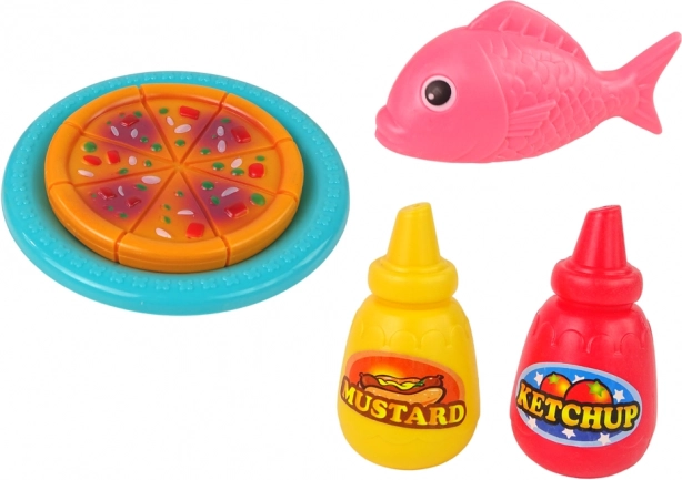Il pacchetto include giocattoli di plastica come pesce, pollo e pizza che aumentano le possibilità di gioco.
