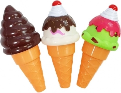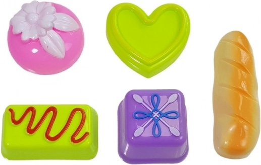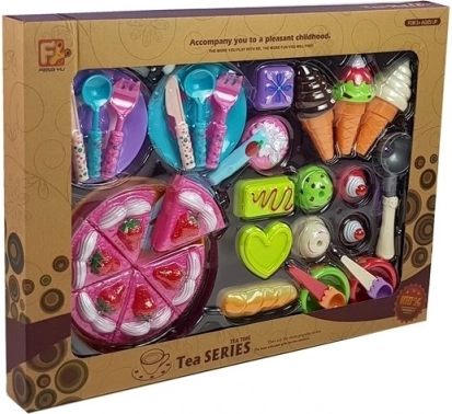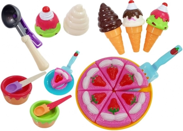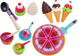 - torta (6 fette), 1 piatto grande, 2 piattini, 3 coni gelato, 2 ciotoline, 5 palline intercambiabili, paletta per gelato, 2 cucchiaini, paletta per torta, 5 formine con “dolcetti”