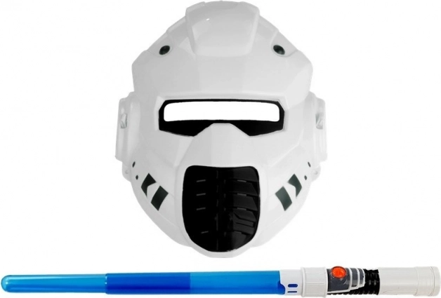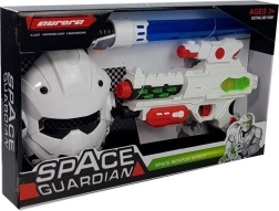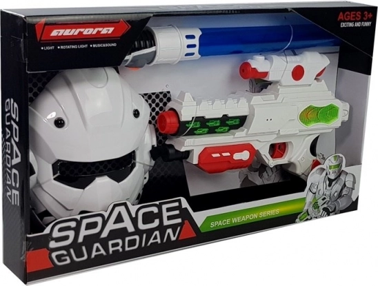 L’arsenale spaziale è composto da una pistola e da una spada telescopica. La combinazione di colori di questi strumenti di difesa presenta tinte vivaci ma smorzate abbinate a un intenso rosso e a una sfumatura corallo. La maschera inclusa nel set è progettata in una palette bianco-grigia, ha un’apertura rettangolare per gli occhi, fori all’altezza della bocca e un elastico fissato sul retro che assicura una perfetta stabilità durante il gioco.