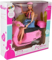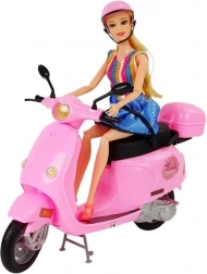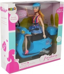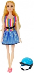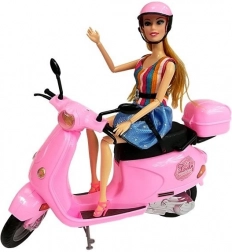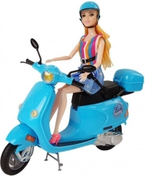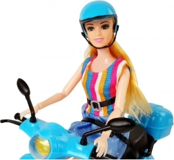 La bambola nel set ha lunghi capelli biondi che possono essere pettinati e stilizzati. 0 vestita con un abito alla moda con righe blu e colorate, che completa il suo aspetto elegante. Le braccia e le gambe mobili permettono di posizionare facilmente la bambola sullo scooter, consentendo ai bambini di creare i propri scenari e storie.