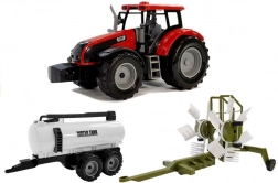 Trattore con rimorchio, ranghinatore e cisterna – rosso