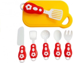 Il set include anche posate di plastica, un coltello e un piccolo tagliere, il che aumenta la creatività durante il gioco del cuoco. È adatto per bambini dai 3 anni in su e conforme alla norma EN71.