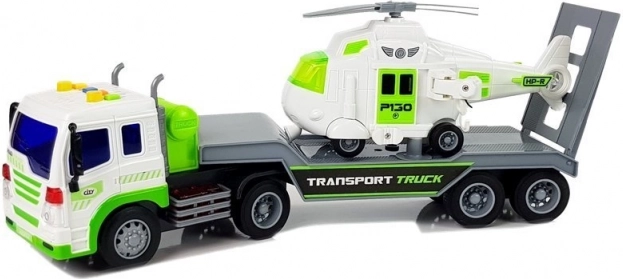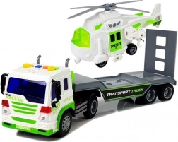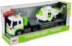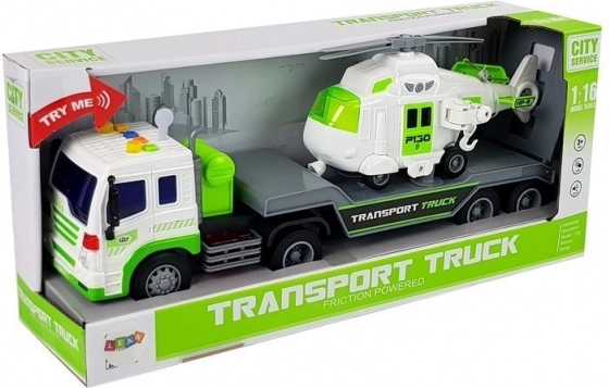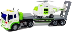 Questo camion da trasporto dettagliato in bianco–verde ha un pianale lungo per caricare comodamente l’elicottero o altri veicoli. La rampa posteriore ribaltabile facilita la salita e il fissaggio sicuro del carico. Il divertimento è garantito dagli effetti luminosi e sonori: sul tetto della cabina trovi 4 pulsanti per avviamento motore, clacson, suono di marcia e retromarcia. Grazie al meccanismo a frizione basta tirare indietro il veicolo e rilasciare.