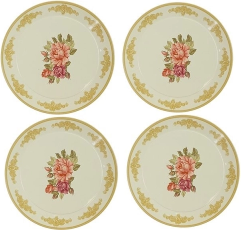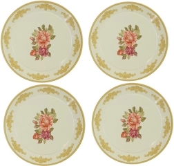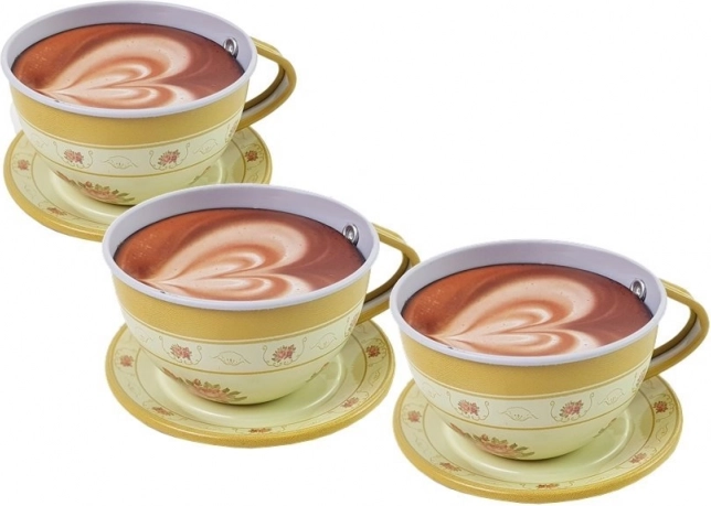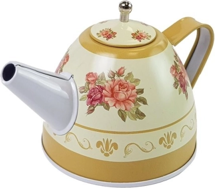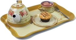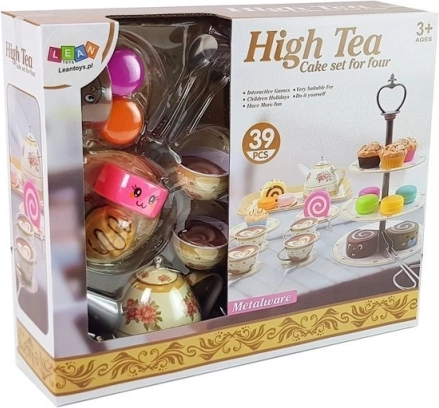 Il set include 4 tazze con piattini, 4 piattini da dessert, una teiera, un vassoio e un’alzata a piani per torte.