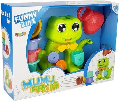 Questa adorabile rana con elementi rotanti invoglia i bambini a giocare nella vasca da bagno. Versando acqua nella sua testa si avvia una piccola ruota idraulica che fa fuoriuscire un getto d'acqua dalla bocca della rana. Inoltre, la rana ha occhi che ruotano al passaggio dell'acqua, attirando e divertendo ogni bambino.