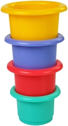 Il set include 4 secchielli di colori diversi che possono essere impilati. Sul loro fondo ci sono fori a distanze diverse attraverso cui si possono osservare diversi flussi d'acqua. Ogni secchiello è decorato con forme di animali incise, come un uccellino, un verme, un coniglio e una tartaruga. Questo giocattolo non è solo divertente, ma aiuta anche i bambini a riconoscere i colori e sviluppare le loro abilità motorie.