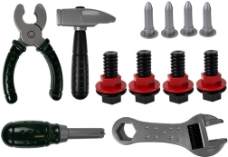 Sega, martello, pinze, cacciavite, chiave, viti, dadi e piastrine per avvitare – tutto in plastica resistente senza spigoli vivi.