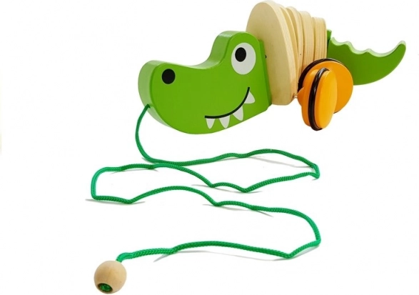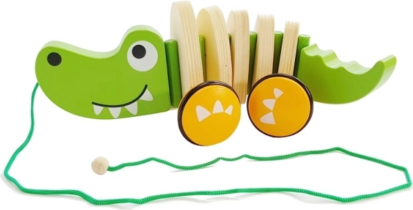 Il simpatico coccodrillo verde con superficie in legno liscia e ruote arancioni è il compagno ideale per passeggiare in casa. Quando viene trainato, il suo corpo ondeggia rendendo il gioco ancora più divertente.