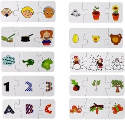 Ogni mini-puzzle è progettato per essere autocorrettivo – si adatta solo la combinazione corretta. I bambini allenano naturalmente classificazione, ordinamento, memoria e vocabolario. Il set copre diverse aree di conoscenza: natura, animali, piante, numeri e lettere.