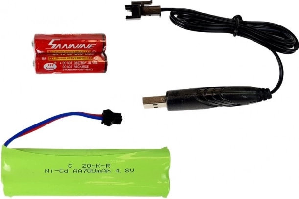 Inclusi un accumulatore da 4,8 V 700 mAh e cavo USB per una ricarica comoda. Fino a 15 minuti di guida dopo circa 200 minuti di ricarica.